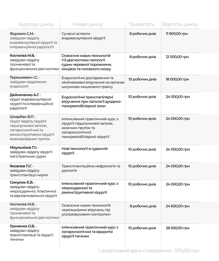 Завданням циклу є підвищення кваліфікації спеціалістів з ендоваскулярної хірургії. Під час стажування Ви поновите теоретичні знання з рентгенендоваскулярної анатомії та сучасних аспектів розвитку ендоваскулярної хірурігї, опануєте (удосконалите) навички та нові методи ендоваскулярних втручань. Нарахування балів БПР - 3 бали за один день (максимально 24 бали). Тривалість навчання: 8 робочих дні, 48 годин (з нарахуванням балів БПР). Кількість додаткових блоків практичного навчання не обмежується. Форма навчання: очна. Викладачі циклу: Фуркало С.М. - завідувач відділу ендоваскулярної хірургії та інтервенційної радіології доктор медичних наук; Кондратюк В.А. - старший науковий співробітник, доктор медичних наук відділу ендоваскулярної хірургії та інтервенційної радіології; Мазанович І.А. - завідувач відділення ендоваскулярної хірургії та інтервенційної радіології.